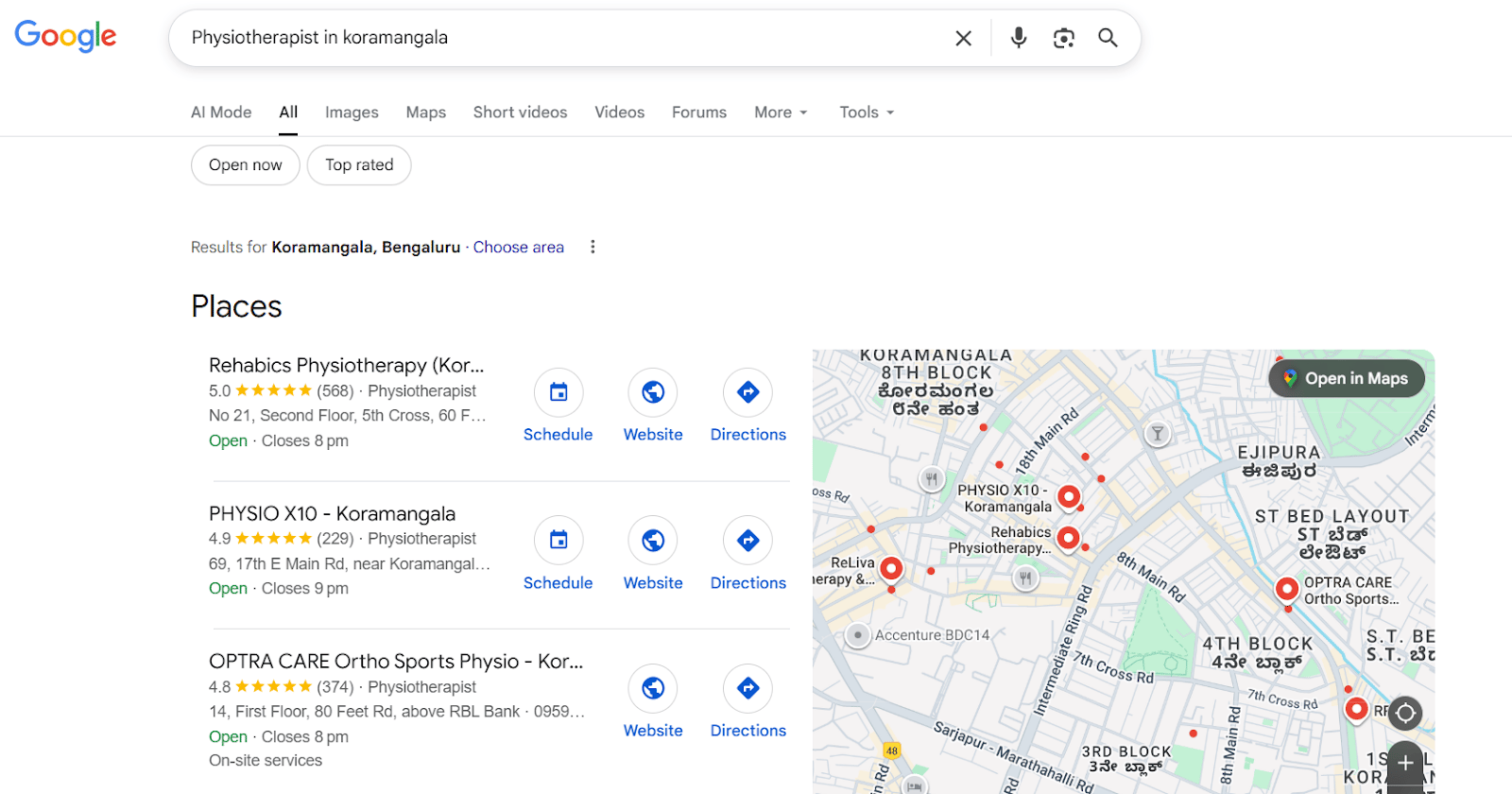 If reviews mention your service + city name (“best physiotherapist in Koramangala”), it boosts your ranking like magic.